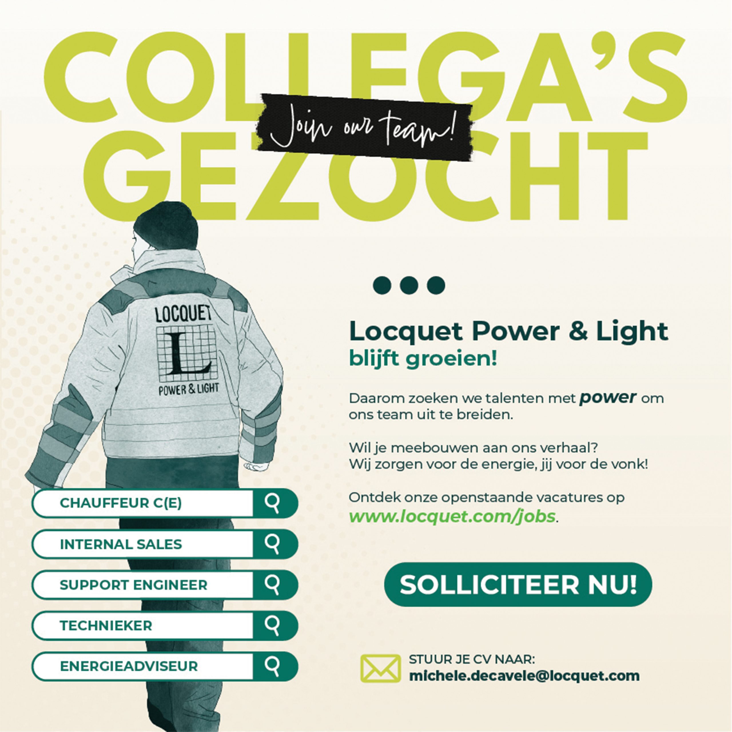 Bij Locquet Power & Light geloven we dat een gelukkig team de motor is achter innovatie en succes. Wij zijn niet zomaar een bedrijf; we zijn een familie die waarde hecht aan creativiteit, ontwikkeling en natuurlijk, een flinke dosis plezier. Als je op zoek bent naar een werkplek waar je je professioneel kunt ontplooien en waar je bijdrage écht het verschil maakt, dan ben je bij ons aan het juiste adres.